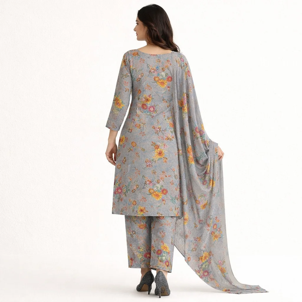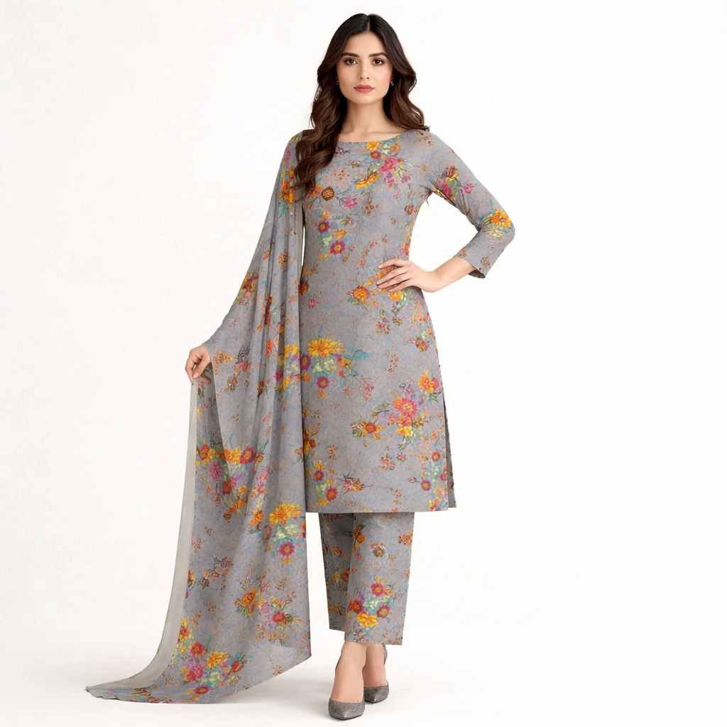 The suit features a high-quality digital printed cotton Bana Dora shirt with an elegant all-over design, giving it a refined and sophisticated look. It is paired with a matching digital printed cotton Bana Dora trouser with coordinated all-over print, creating a complete and fashionable outfit. The digital printed cotton dupatta enhances the overall appearance by adding a graceful and stylish finishing touch.