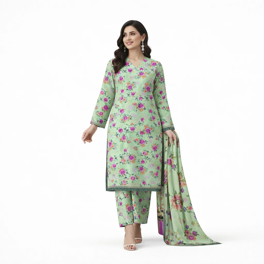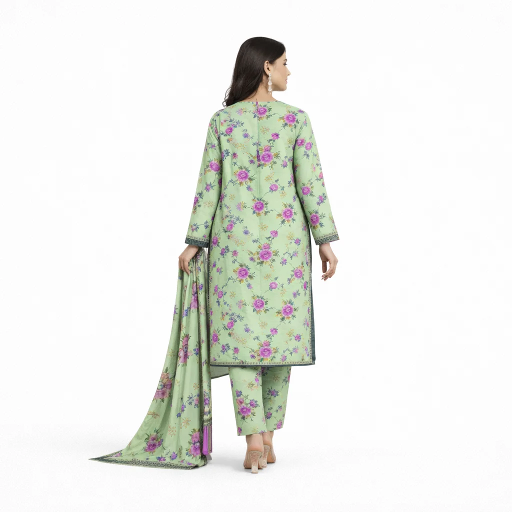 The shirt features high-quality digital printed cotton with an elegant all-over design that gives a sophisticated and graceful appearance. It is paired with a matching digital printed cotton trouser with a coordinated all-over print, creating a complete and fashionable look. The digital printed cotton dupatta enhances the beauty of the outfit and adds a stylish finishing touch.