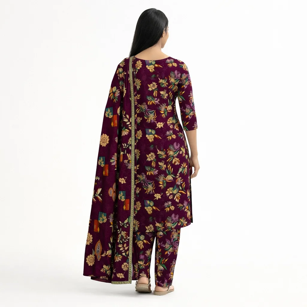 Crafted from premium quality cotton fabric, this outfit features a sophisticated all-over digital printed shirt paired with a coordinated digital printed cotton trouser. The matching digital printed cotton dupatta enhances the overall aesthetic, delivering a polished and graceful finish.