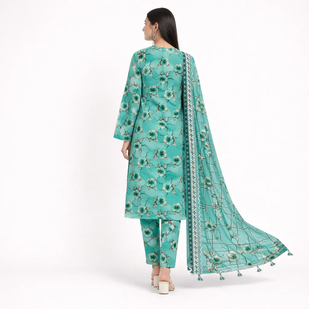 The outfit features a beautifully designed digital printed cotton all-over shirt paired with a coordinated painted cotton trouser. The matching digital printed cotton all-over dupatta completes the look, adding sophistication and balance to the overall design.