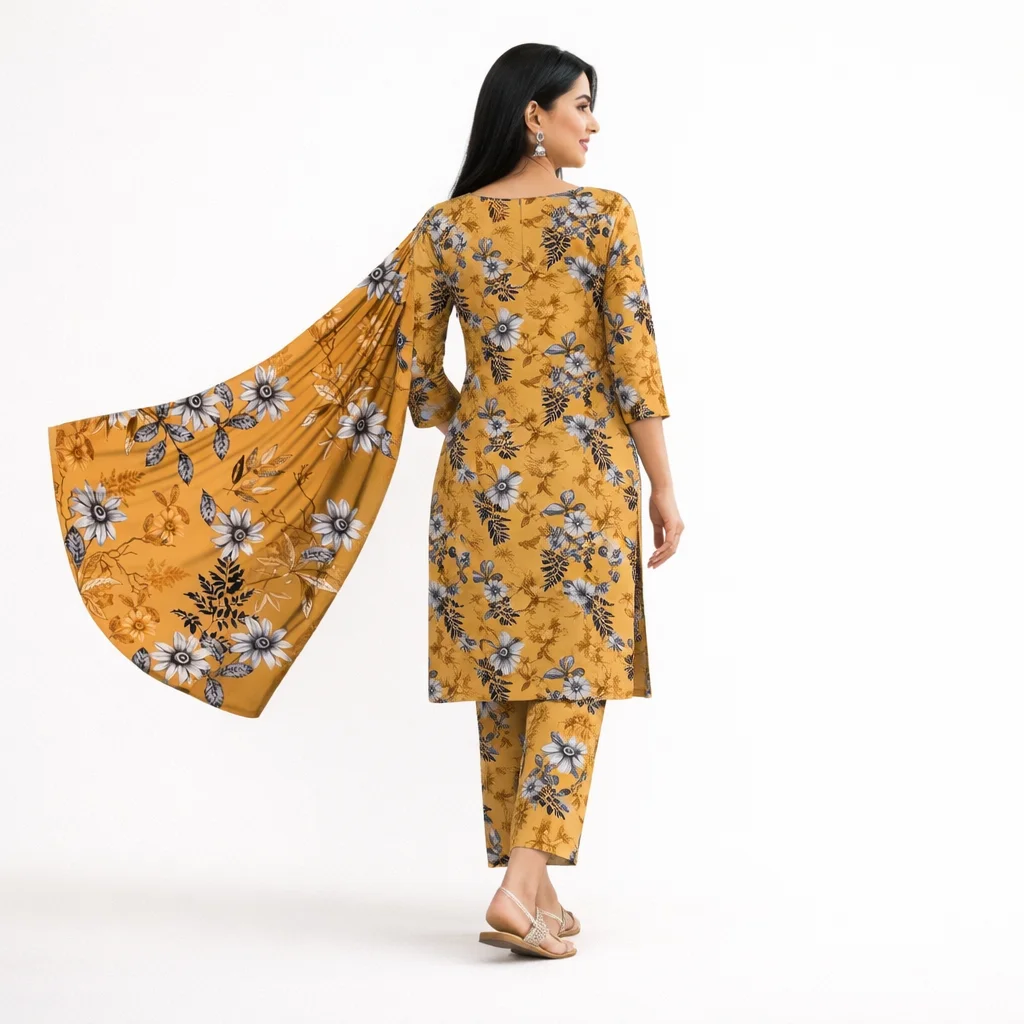 The shirt features high-quality digital printed cotton with a beautiful all-over design that gives a refined and graceful look. It is paired with a matching digital printed cotton trouser featuring a coordinated all-over print, creating a complete and fashionable outfit. The printed cotton dupatta enhances the overall appearance and adds a stylish and elegant finishing touch.
