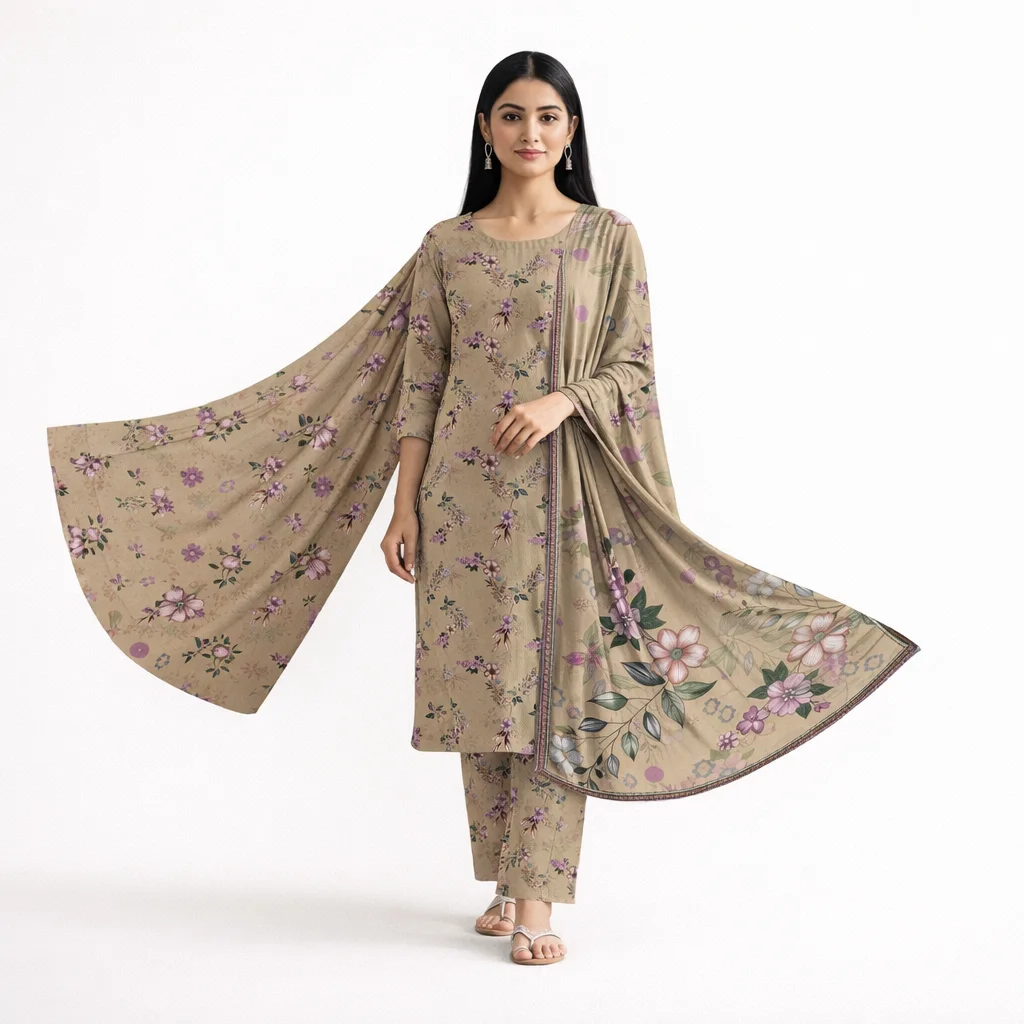 The shirt features high-quality digital printed cotton with a beautiful all-over design that gives a refined and graceful look. It is paired with a matching digital printed cotton trouser featuring a coordinated all-over print, creating a complete and fashionable outfit. The printed cotton dupatta enhances the overall appearance and adds a stylish and elegant finishing touch.
