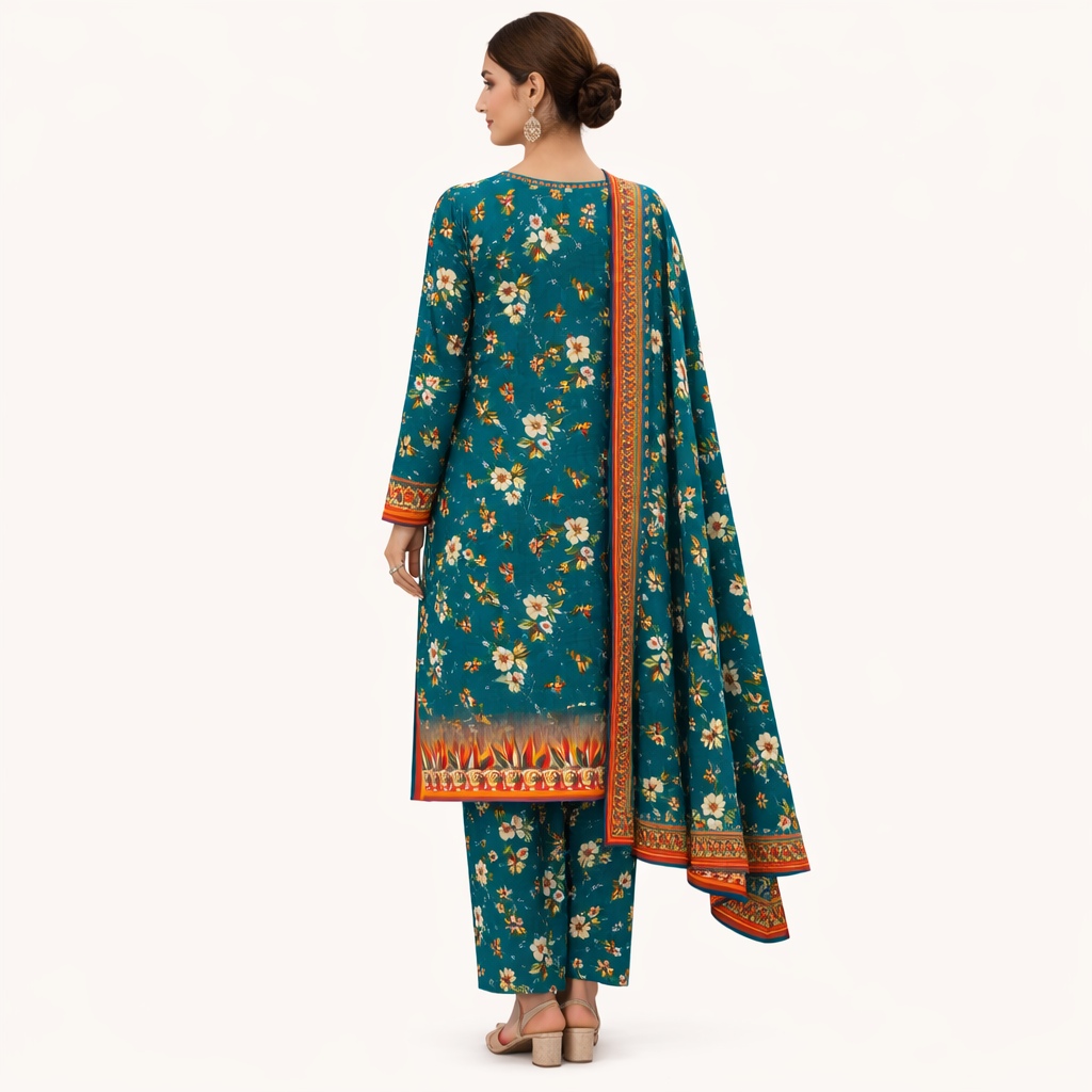 Premium quality digital printed lawn shirt with matching trouser and beautiful dupatta. Perfect summer collection for ladies in Pakistan.